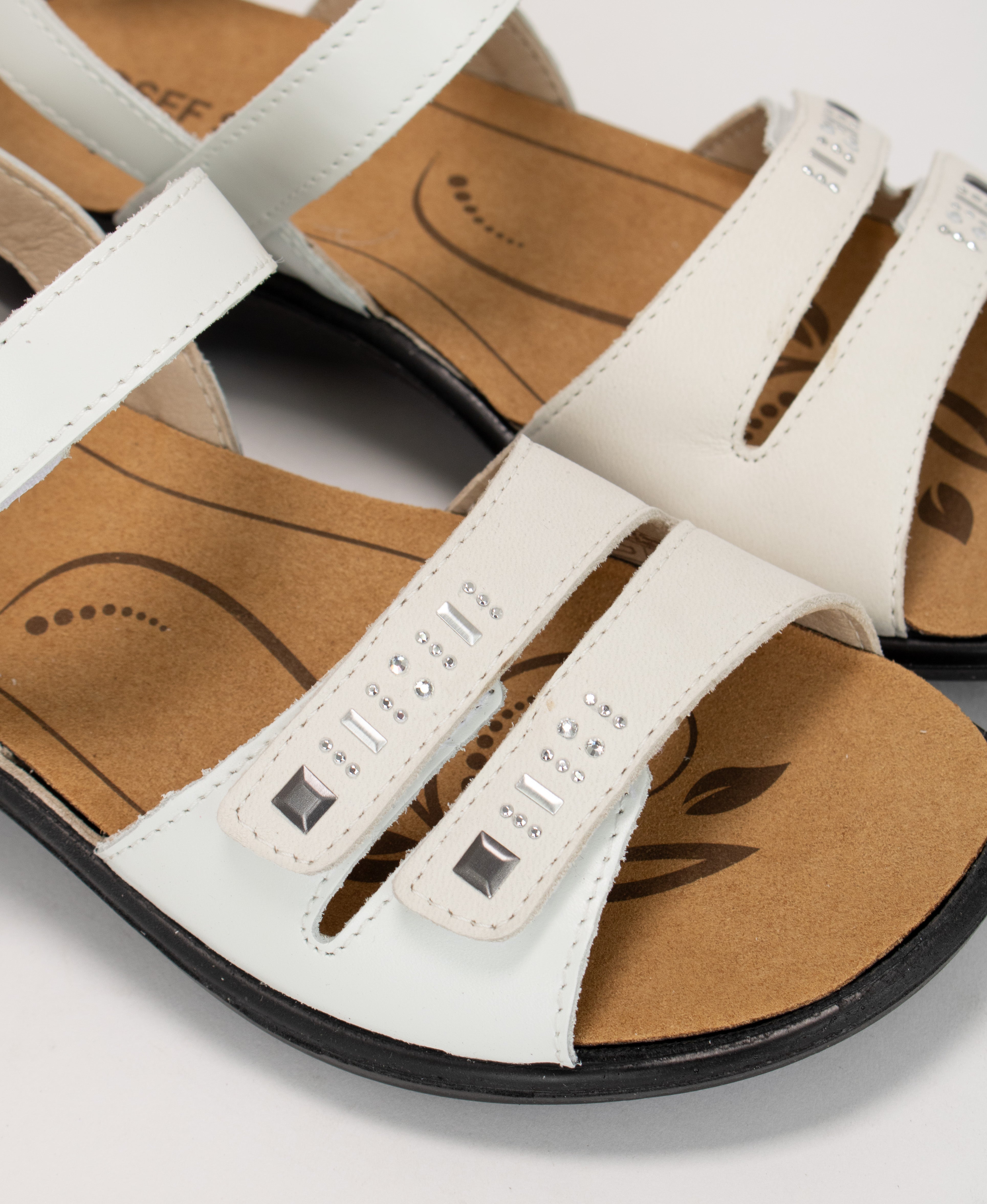 IBIZA 86 : Cette sandale à lanières est confectionnée en cuir lisse avec des ornements argentés sur les brides. La sandale comporte également trois sangles réglables avec fermeture velcro pour un ajustement sûr et facile. À l’intérieur, une assise plantaire amovible offre un amorti et un soutien optimaux. Une semelle légère en polyuréthane offre une traction flexible et durable.